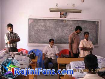 The goody bag consited of 2 Sets of School uniform, One Big Bag, 4 Pens, 15 note books, 1 Geometry Box, one set of leather slippers and the total of each bag consisted of proceeds worth Rs1,500. No words to praise the efforts of Rajini fans from Mahabalipuram who ran from nook and corner to arrange for the necessary items forming the goody bags. Tailors were arranged to come to the school to take the measurements of the children along with the Slippers Mart Vendors to take the foot measurements for the slippers. There is just one magic word "Rajini" which motivates the fans from all over the world in completing the enduring tasks with no sign of displeasure or discomfort and to accomplish the objective with selfless motive.