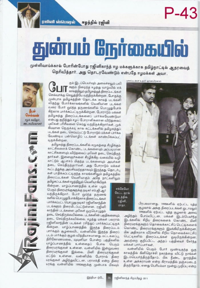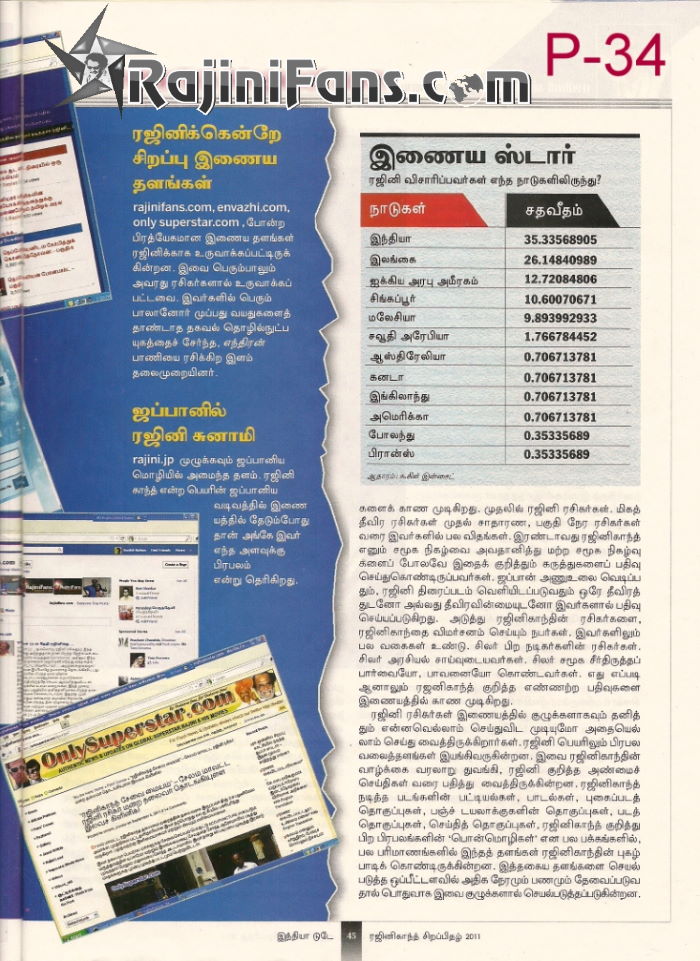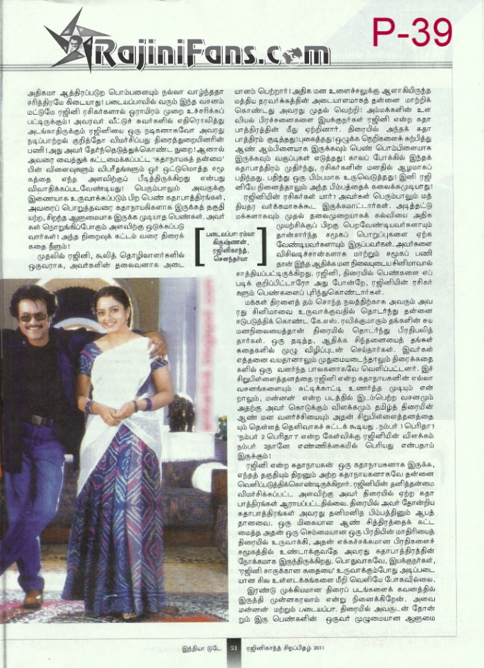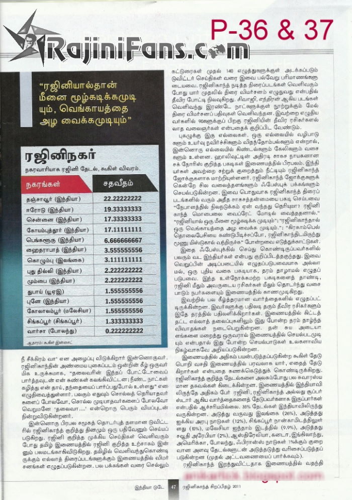 Inida Today came up with exclusive Superstar Rajinikanth birthday special in November 2011. This edition contains 100% related to Thalaivar news and articles. Please browse through all the pages to enjoy the flashback news by India Today.