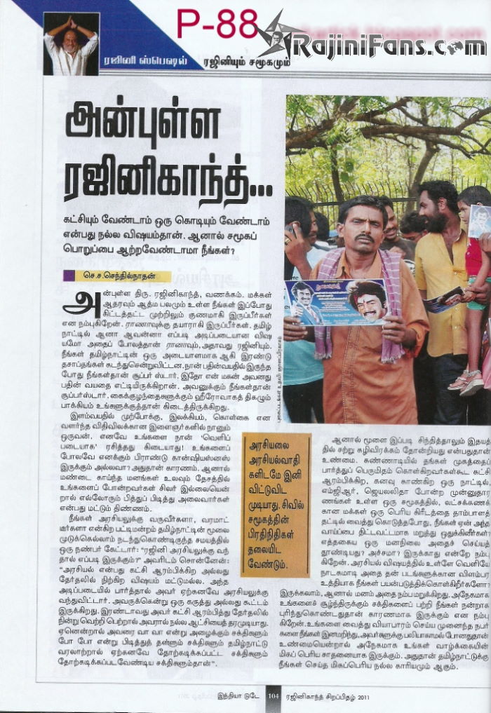 Inida Today came up with exclusive Superstar Rajinikanth birthday special in November 2011. This edition contains 100% related to Thalaivar news and articles. Please browse through all the pages to enjoy the flashback news by India Today.