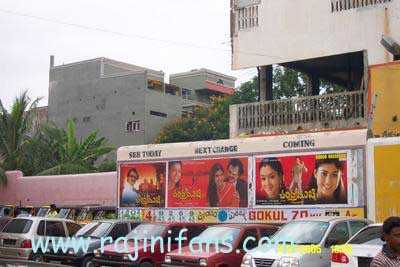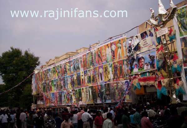 Members of Karnataka State Rajanikant Fans' Association have decorated a board in front of Naga theatre with posters of Rajani's movies. Posters include Hindi, Tamil and Kannada movies starring Rajani.