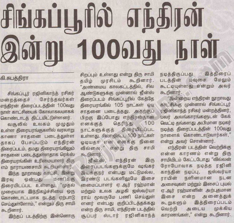 சந்திரமுகி, சிவாஜியைத் தொடர்ந்து ‘எந்திரன்’ 100 நாட்களை கடந்து விட்டது… மார்க்கெட்டிங் உத்தி, ஆலிவுட் காப்பி என்று வாய்க்கு வந்தபடி விமர்சனம் செய்த ‘புண்ணியவான்கள்’ இன்னிக்கு சிங்கப்பூர்ல இந்த கொண்டாட்டத்தையும், இவ்வளவு சின்ன நாட்ல இவ்ளோ நாள் ஓடியும் இன்னிக்கு வந்த கூட்டத்தையும் பார்த்தா எல்லாத்தையும் மூடிப்பானுங்க… தலைவர் ராக்ஸ்…