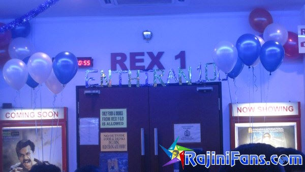 நாங்களெல்லாம் படம் ஆரம்பிக்கும்போது திரைக்கு பக்கத்தில் சென்று கலர் காகிதங்கள் தூவி ஒரே அமர்க்களம் பண்ணிவிட்டோம். வெளியே நாங்கள் கொண்டாடியதை பார்த்துவிட்டு டிக்கெட் எடுத்து படம் பார்க்க வந்தவர்கள் பலர். தலைவர் அறிமுகம், சிட்டி அறிமுகம், ‘செல்லாத்தா’ பகுதி, சிட்டி வெர்ஷன் 2.௦ அறிமுகம் போன்ற காட்சிகளில் நாங்கள் யாரும் இருக்கையில் அமரவில்லை. செம கலாட்டா… இங்கே FDFS பார்த்த திரையரங்கில் அந்த அளவு இடவசதி இல்லாததால் சற்று அடக்கி வாசிக்க வேண்டியிருந்தது. எல்லாத்துக்கும் சேத்து இன்னிக்கு கலக்கிட்டோம். நாங்க பண்ண எல்லா அராஜகத்துக்கும் பொறுமை காத்து, நாங்க போட்ட குப்பைகளை எல்லாம் சுத்தம் செய்து, கொண்டாட்டத்தில் பங்கும் பெற்ற ரெக்ஸ் திரையரங்கு உரிமையாளர் மற்றும் உரிமையாளர்களை எவ்வளவு பாராட்டினாலும் தகும்.