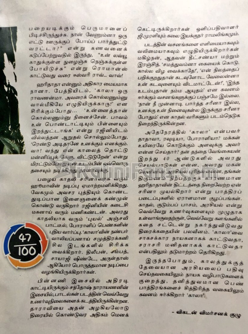 Special mention should go to Easwari Rao (as Kaala's wife, Selvi) and Anjali Patil (as Puyal, the girlfriend of one of Kaala's sons). You will fall in love with their characters. The theme song, which, by now, is hugely popular is where Ranjith stamps his brilliance as a writer and director, carefully feeding the appetite of Rajinikanth fans. This would be remembered as one of the best climaxes in a Rajinikanth movie. Ranjith owes to his excellent technical crew (cinematographer Murali, music director Santhosh Narayanan, editor Sreekar Prasad and art director Ramalingam) for helping him visualise and deliver this 51% Rajini-49% Ranjith movie.
