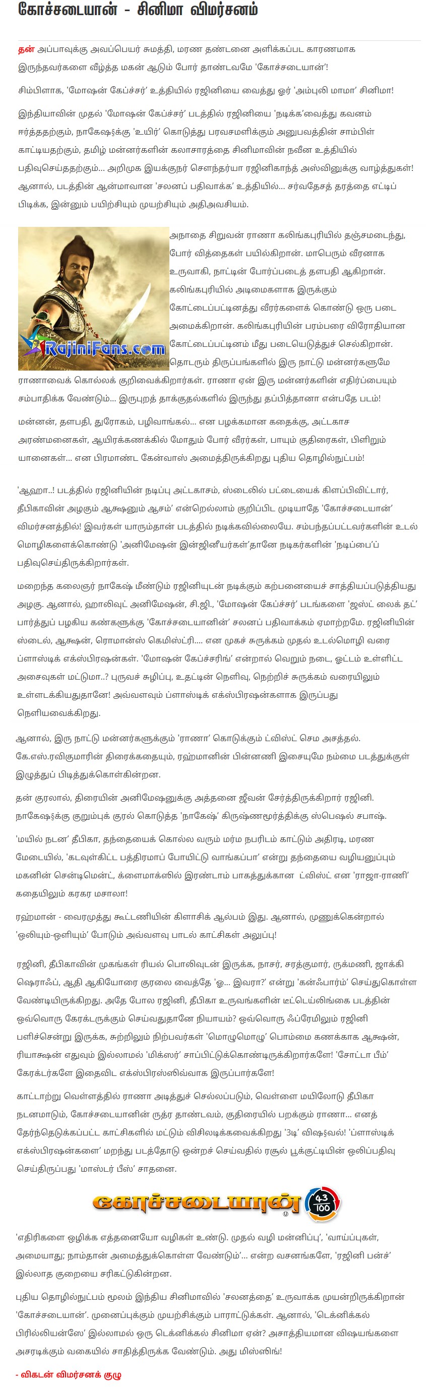 Scriptwriter K.S. Ravikumar has done the story justice with enough twists and turns to hold one's attention and AR Rahman too delivers with a quite a vibrant, commercial score. Fans in Tamil Nadu were thrilled when yesteryear actor Nagesh came to life in an animated avatar.