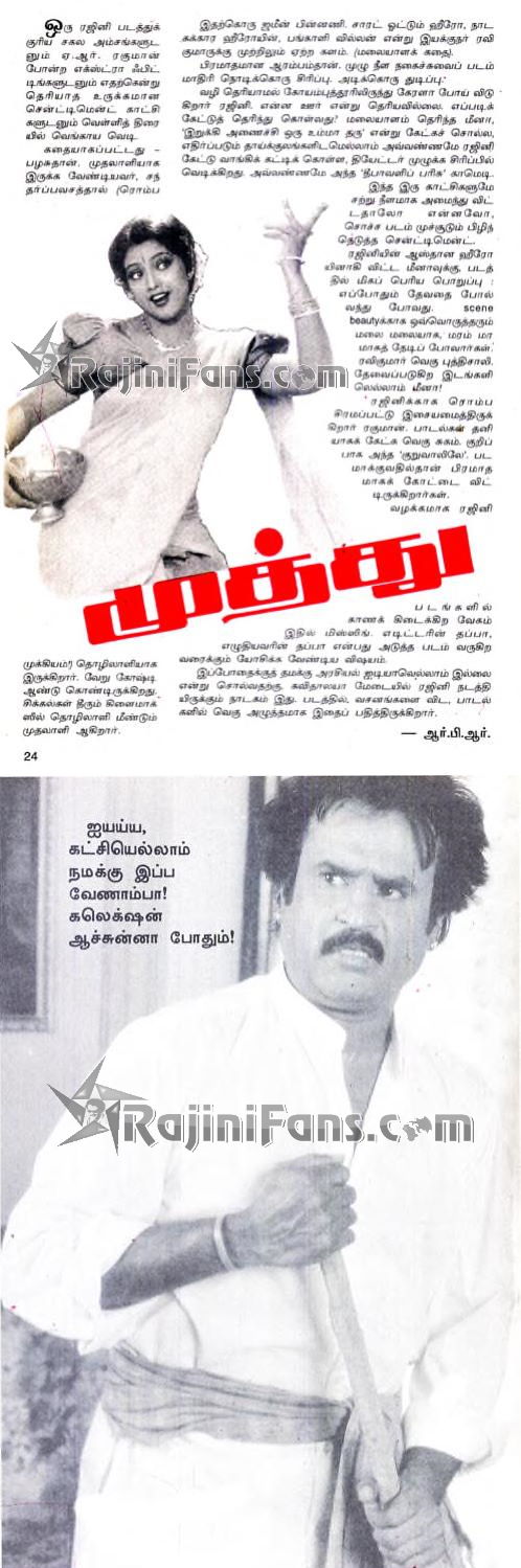 As in any recent Rajnikanth movie, he dominates the proceedings, leaving little for the others to do as he successfully carries the movie on his shoulders. Meena looks sweet and acts cute, especially during her initial altercations with Rajnikanth. Sarathbabu has always been a lucky actor for Rajnikanth with all of the movies where they appeared together being hits. Muthu adds to this list. A.R.Rehman delivers a hit soundtrack with Oruvan Oruvan... and Kuluvaalile... being the picks. Thillaanaa Thillaanaa... is catchy and picturised extremely well with the bright colors and fast steps.