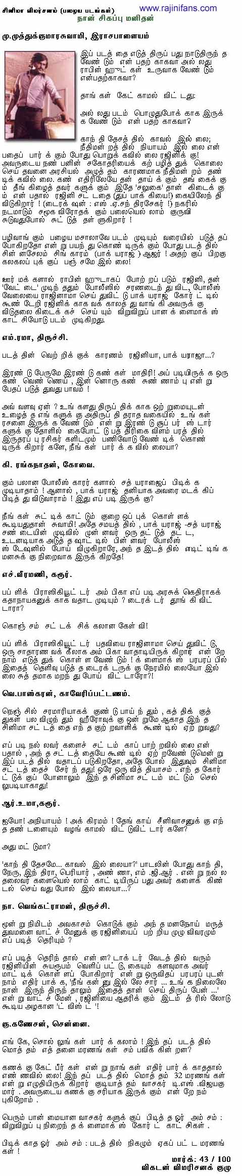 இது மக்களுக்கான வணிக சினிமா, மக்களுக்கான ஒரு சூப்பர் ஸ்டார் வழங்கிய ஒரு படம். ரஜினியின் சூப்பர் ஸ்டார் ஹூட் பயணத்தில் இந்த ராபின் ஹூட் மறக்க முடியாதவன்.