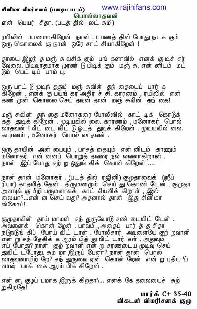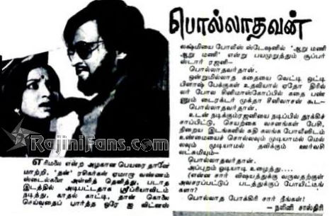 Polladhavan is a 1980 Tamil movie Indian action thriller film produced by S. Ravi, and directed by Muktha Srinivasan who also wrote the screenplay. A remake of the 1976 Kannada film Premada Kanike, it stars Superstar Rajinikanth, Lakshmi and Sripriya. The film revolves around a wealthy merchant who murders a would-be rapist, then keeps his daughter's nanny, who was both the intended victim and a witness, captive in his house.