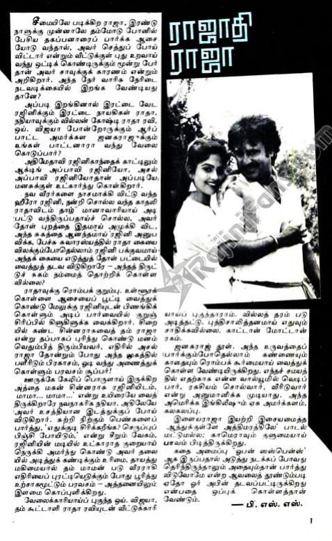 முழுக்க முழுக்க ஹீரோ படம் என்பதால், ராதா, நதியா இரண்டு பேருமே டெபாஸிட் இழக்கிறார்கள்! சொந்தப் படம் என்பதால் பார்த்துப் பார்த்து அடித்திருக்கிறார் இளையராஜா. ஆனால், டியூன்களில் பழைய வாசனை கொஞ்சம் அதிகம்தான்!