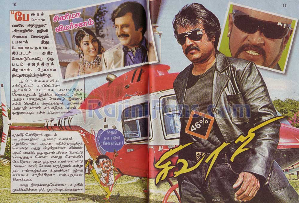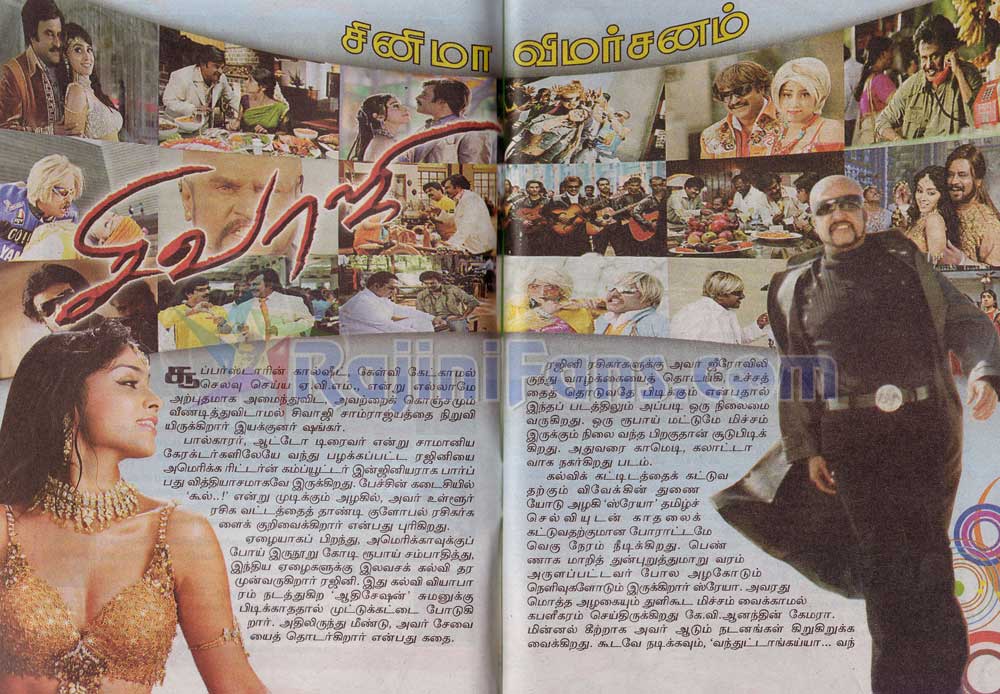 Sivaji (Rajnikanth) is a rich NRI software pro. Son of caring parents (Manivannan and Vadivukkarasi), and the nephew of an ever helpful uncle (Vivek), Sivaji comes to India with the larger than life dream of running universities and hospital for the benefit of the poor. (The idea is smartly done when he talks of every riches coming to India, but beggary not going away).