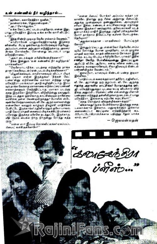 Un Kannil Neer Vazhindal (transl. If tears well up in your eyes) is a 1985 Indian Tamil-language action film written and directed by Balu Mahendra. It stars Rajinikanth and Madhavi, with Y. Gee. Mahendra in a prominent role. V. K. Ramasamy and Senthamarai play other pivotal roles. The film, released on 20 June 1985, was an average grosser at the box office and had a theatrical run of 75 days.